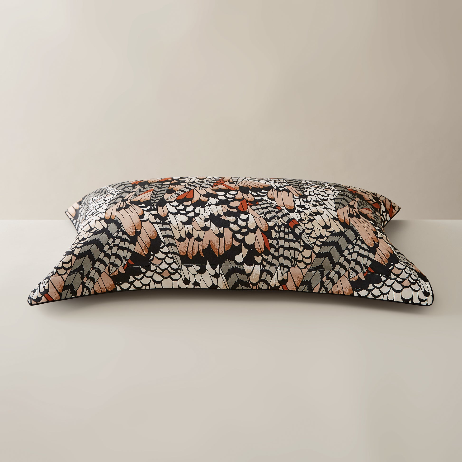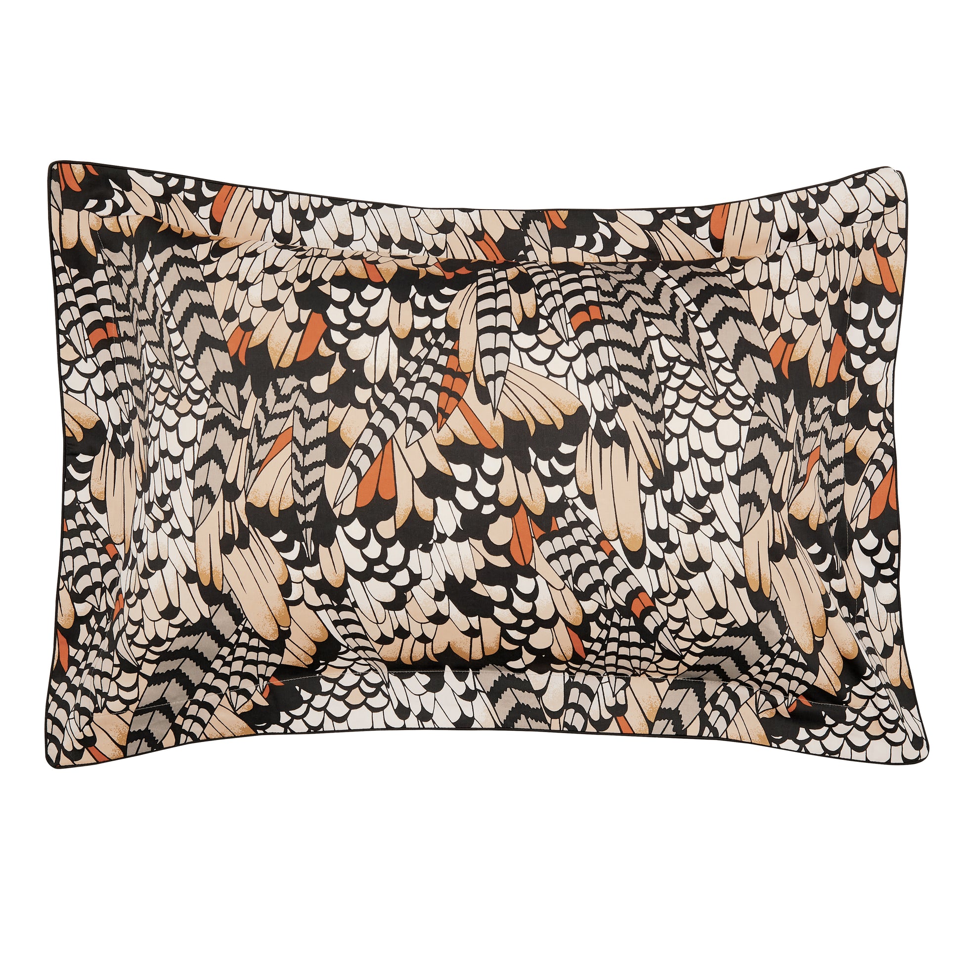 This daring luxurious pillowcase has a pattern of feathers in shades of black, cream, brown and orange that exudes an autumn atmosphere.